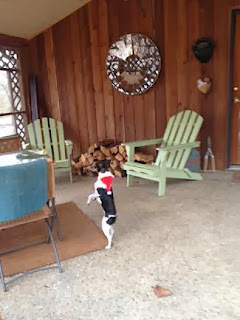Daisy dancing around on his porch when we first arrived.  She loves Bernd.